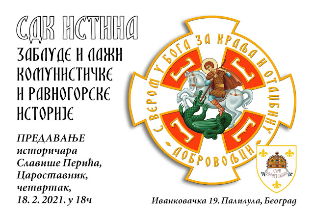 У клупским просторијама, у четвртак 18. фебруара, у 18ч, одржаће се предавање историчара г. Славише Перића које ће се бавити разобличавањем заблуда, фалсификата и лажи које су изнете и које се и дан - данас износе против Српског добровољачког корпуса (СДК), тзв. Љотићеваца, како од стране комунистичких, тако и од стране равногорских историчара.